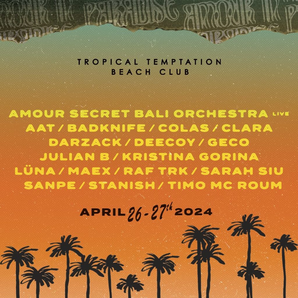 Get ready for an extraordinary weekend escape as Tropical Temptation and Amour in Paradise join forces to bring you two days of pure bliss! From April 26th to 27th, 2024, immerse yourself in the ultimate fusion of paradise and passion at this special beachside festival. Prepare to be enchanted by an eclectic lineup of musical